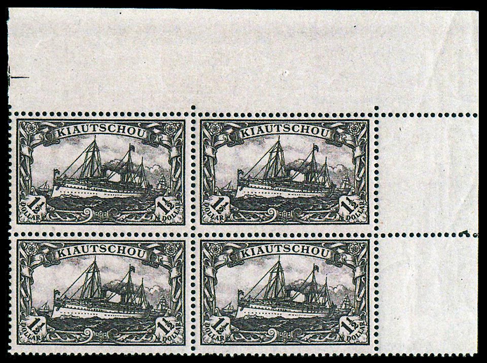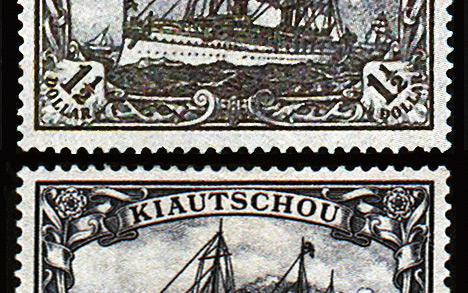 In einem Zeitraum von fast 16 Jahren wurden für die dort unterhaltenen Postämter entsprechende Briefmarken ausgegeben. Neben den anfangs verwendeten Krone/Adler-Ausgaben ohne und mit Aufdruck „China“ waren dies ab 1901 die Ausgaben der Schiffsserie mit einer Abbildung der SMS Hohenzollern und der entsprechenden Inschrift „Kiautschou“. Während bis Ende 1905 die Währungsbezeichnung auf Mark und Pfennig lautete, wurde aufgrund von Umrechnungsschwierigkeiten aber auch aufgrund politischen Drucks der chinesischen Behörden zum 1.10.1905 eine neue bildgleiche Serie verausgabt, deren Wertstufen nunmehr in (mexikanischen Silber-)Dollar und Cent angegeben wurden.