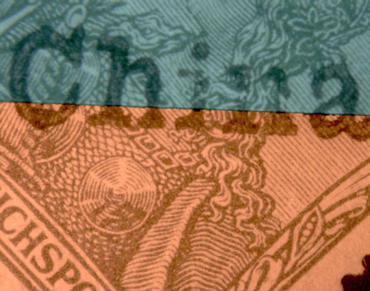 Nach bisherigen Erfahrungen lässt sich diese Methode bedauerlicherweise nicht auf jedes andere Gebiet übertragen, da die Zusätze, die offensichtlich für die IR-Reaktion verantwortlich sind, bei der Reichspost nur innerhalb eines bestimmten Zeitraums verwendet wurden. Ab etwa 1894 wird als zusätzliches Sicherungsverfahren gegen die Fälschungsversuche der Freimarken die sog. Hammer´sche Stempelfarbe zur Entwertung eingesetzt (vgl. Jäschke-Lantelme, Die Postfälschungen des Deutschen Kaiserreichs, Dessau 2000, S. 32). Mit Einsetzen der Kriegsbewirtschaftung (1914/15) werden diese Zusätze der Stempelfarbe offensichtlich nicht mehr beigemischt, ein eindeutiges Kennzeichen steht ab diesem Zeitraum somit für die Prüfung nicht mehr zur Verfügung.